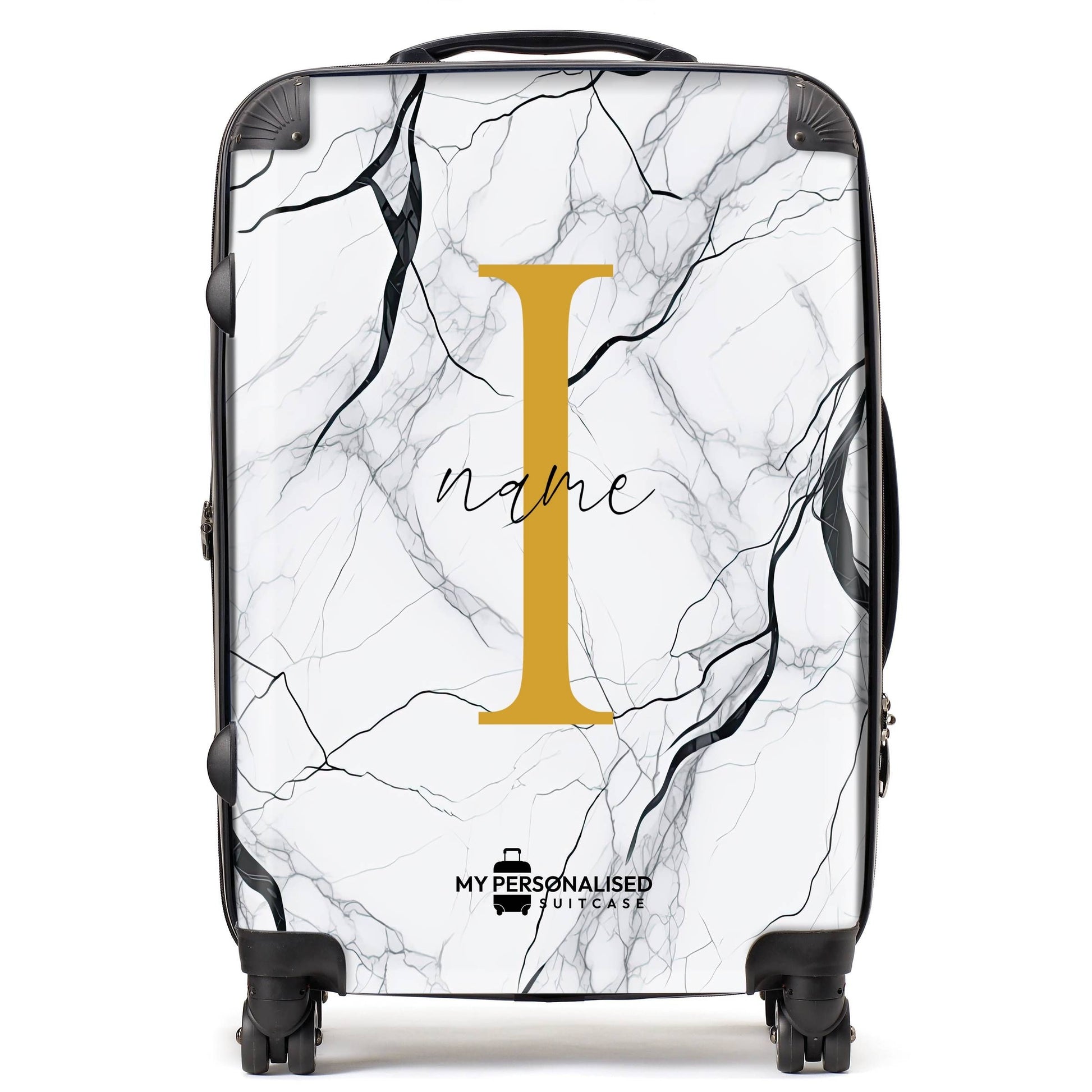 Our Personalised Suitcase with a base colour of White & Black marble is the perfect suitcase for you to personalise and make it your own. Personalise your luggage unique to you and travel in style knowing you will always find your suitcase on the airport carousel.
